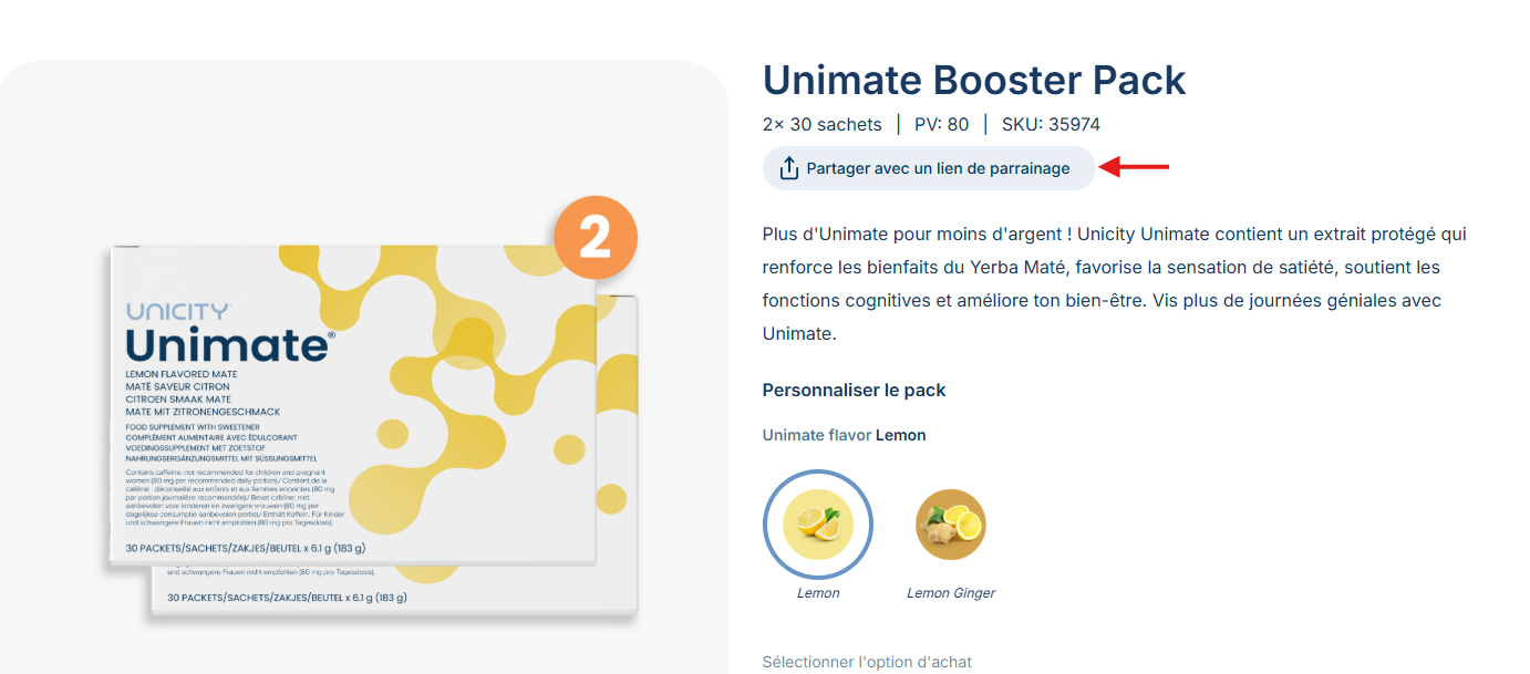 Tu peux créer et partager des liens de référence qui conduisent directement à la page d'un produit spécifique sur shop.unicity.com. La personne que tu as recommandée arrive donc exactement là où elle doit aller, sans être redirigée vers d'autres produits ou pages.