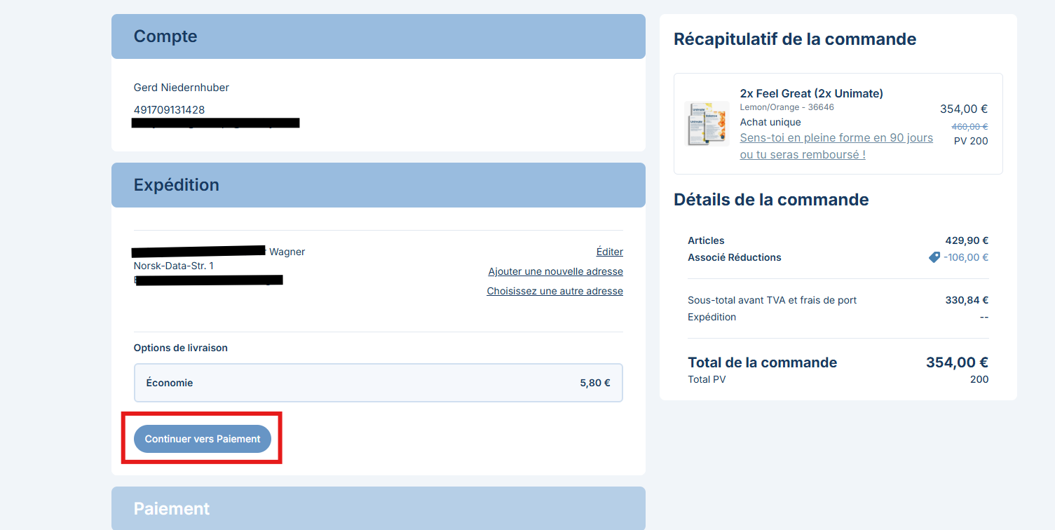 Sur la page de paiement, modifie les options de livraison si nécessaire, sélectionne l'option de livraison que tu souhaites utiliser, puis clique sur "Continuer vers Paiement."