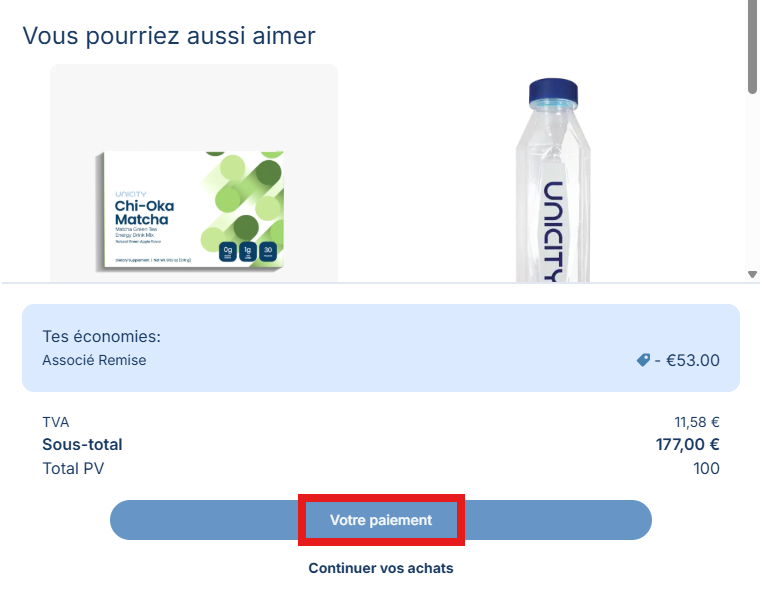 Si tu souhaites passer à la caisse, clique sur "Acheter maintenant". Si tu souhaites continuer à explorer la section des produits, clique sur "Continuer vos achats".