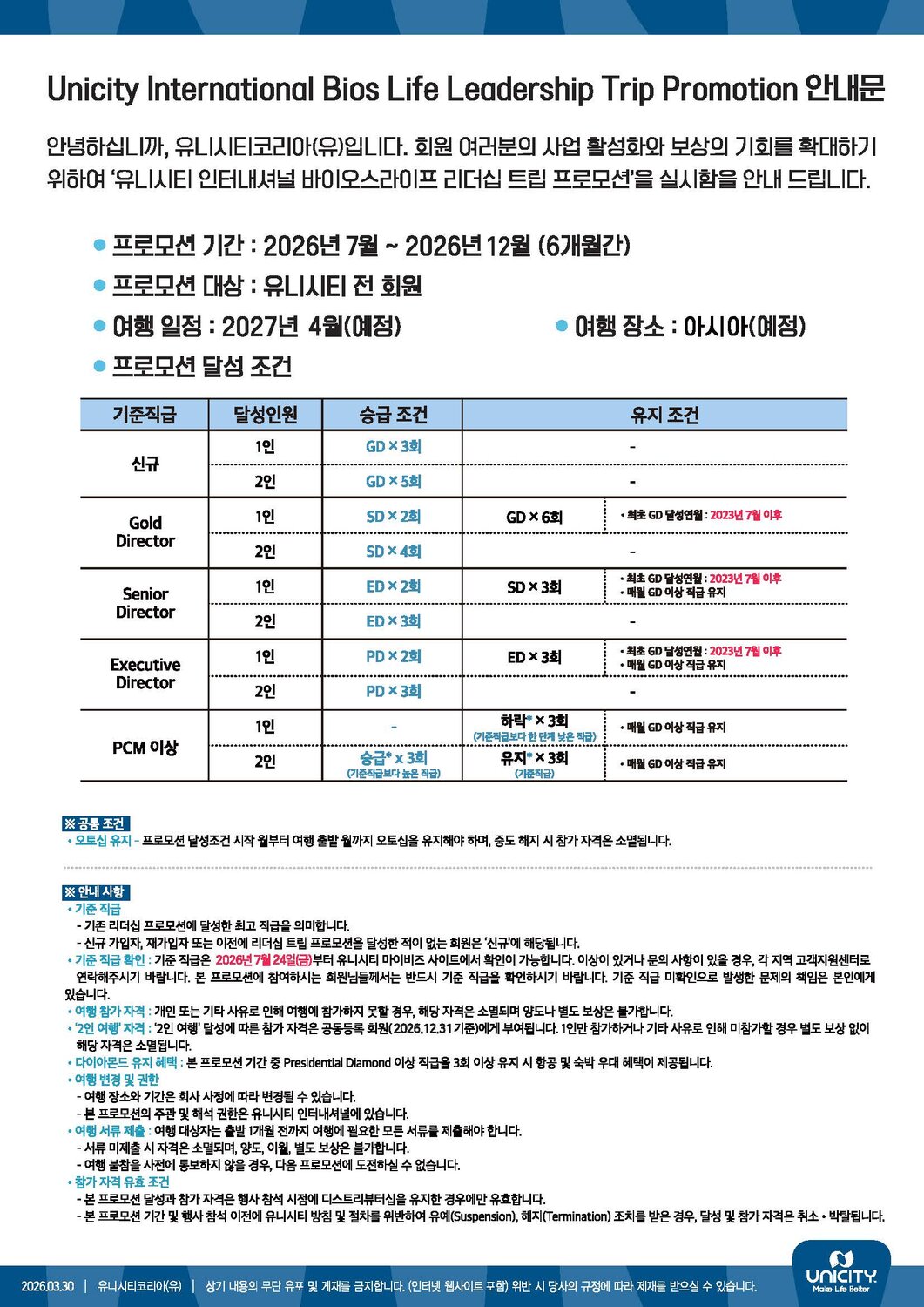 Unicity International Bios Life Leadership Trip Promotion 안내문