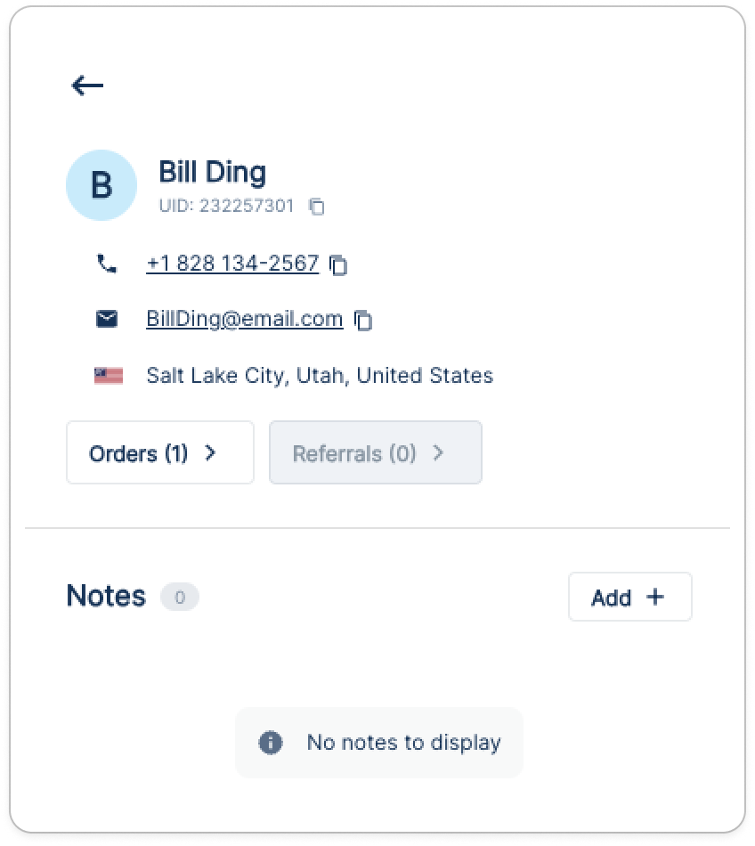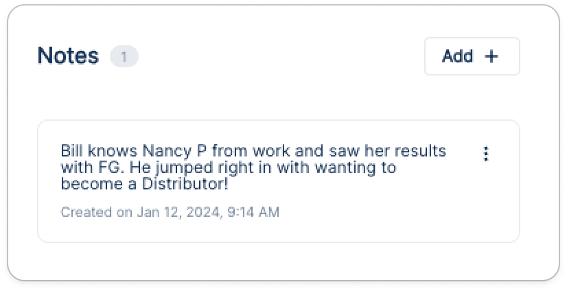 2. At the bottom of the profile window, you will see the Notes space. Click or tap “Add +” to begin adding a note. Each note has a limit of 500 characters.