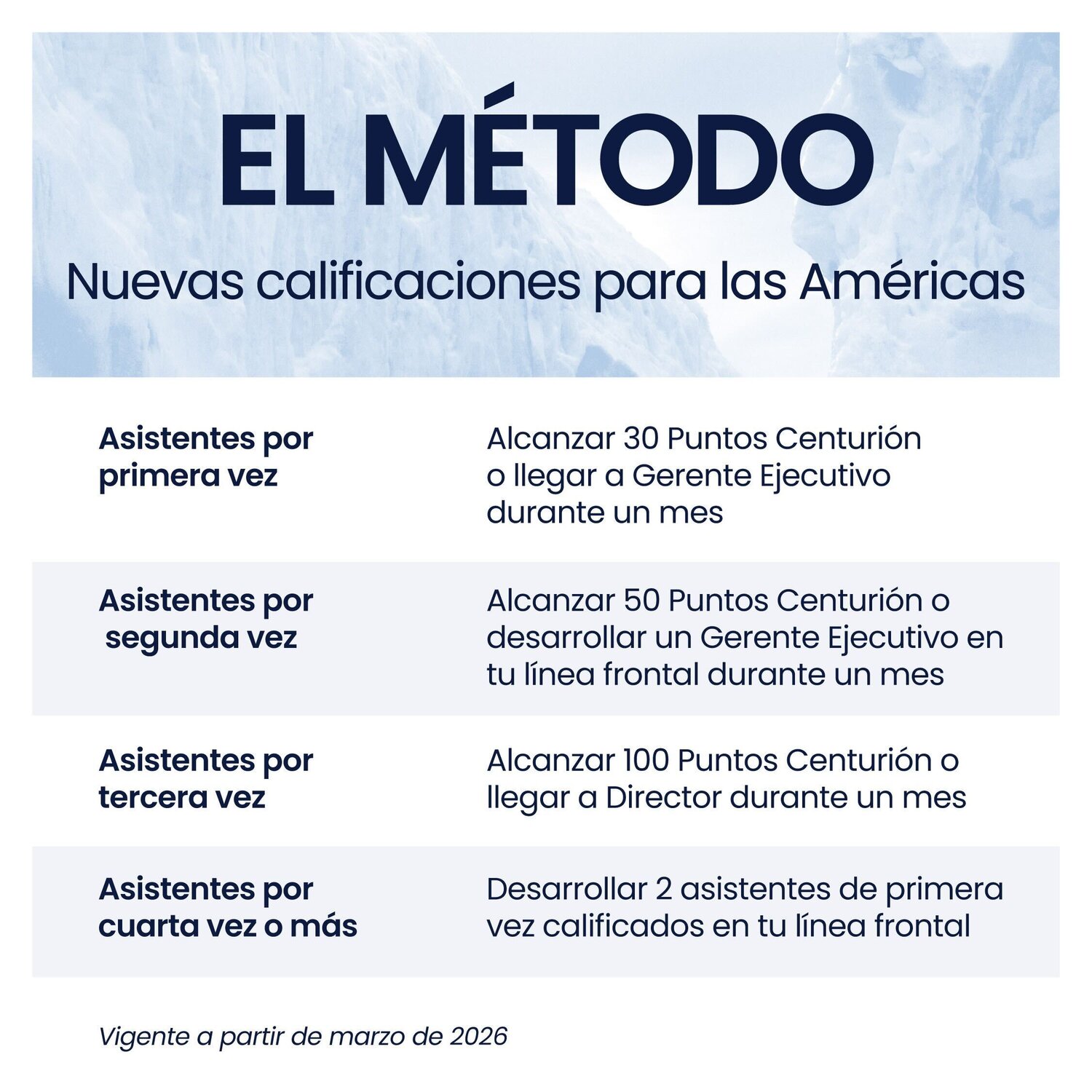 Asistentes recurrentes (segunda vez o más): Alcanzar el rango de Director (o superior) por dos meses entre diciembre 2025 - febrero 2026 Y tener un socio frontal calificado para asistir a El Método por primera vez.