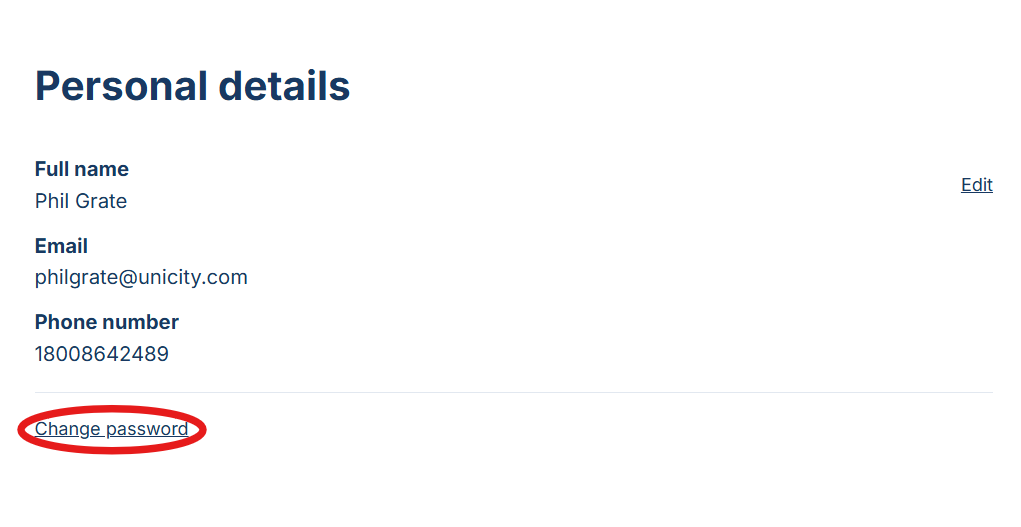 On the Personal Details page, click the “Change Password” button to make changes.