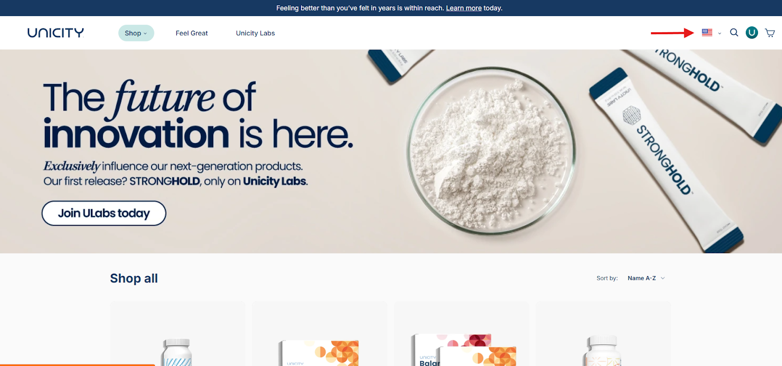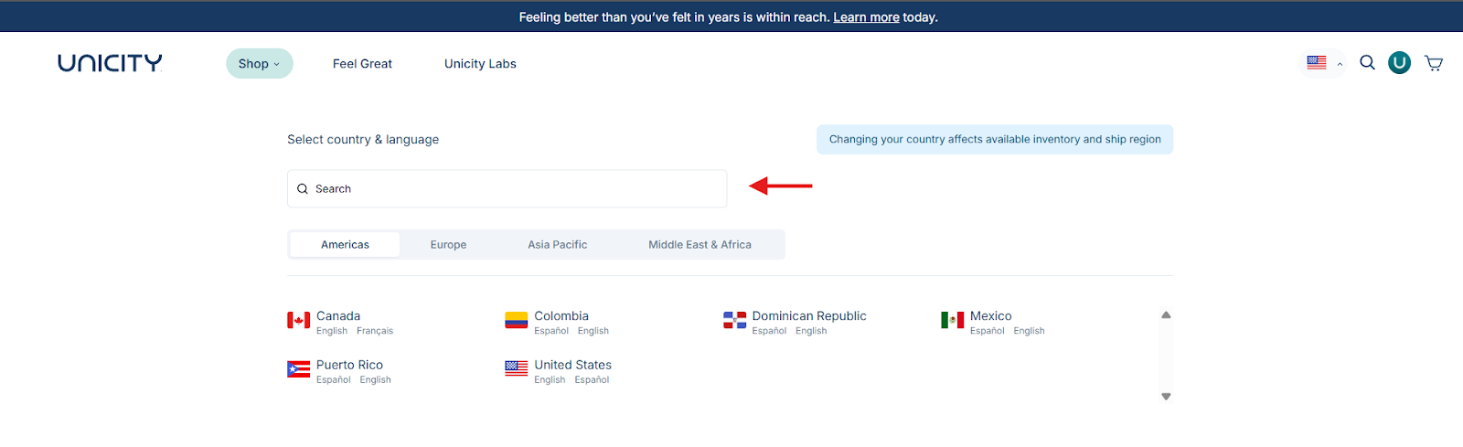On the top of the page at shop.unicity.com, select the flag icon to open the country selector.