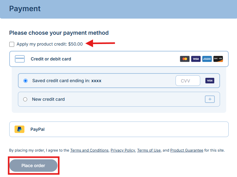 On the payment page, check the box labeled “Apply my product credit,” then continue with placing your order.