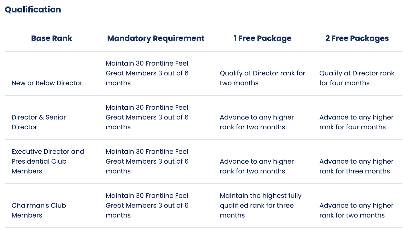 Personal 10-pack purchases do not count as 10 frontline Feel Great Members. You must have 30 frontline Member or Distributor accounts purchasing Feel Great to meet the mandatory requirement.