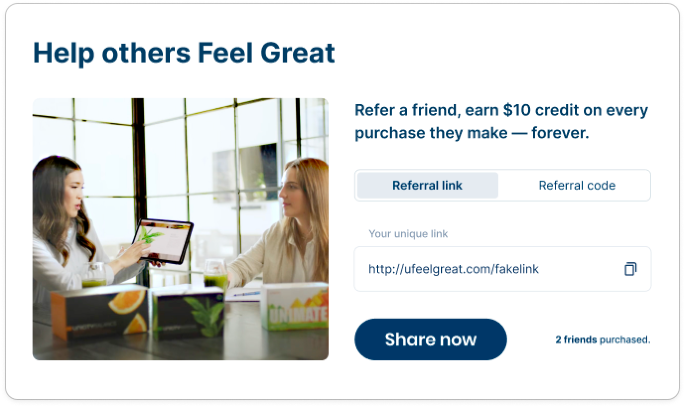 Members have a unique referral link that allows them to earn product credit for sharing Feel Great with others.