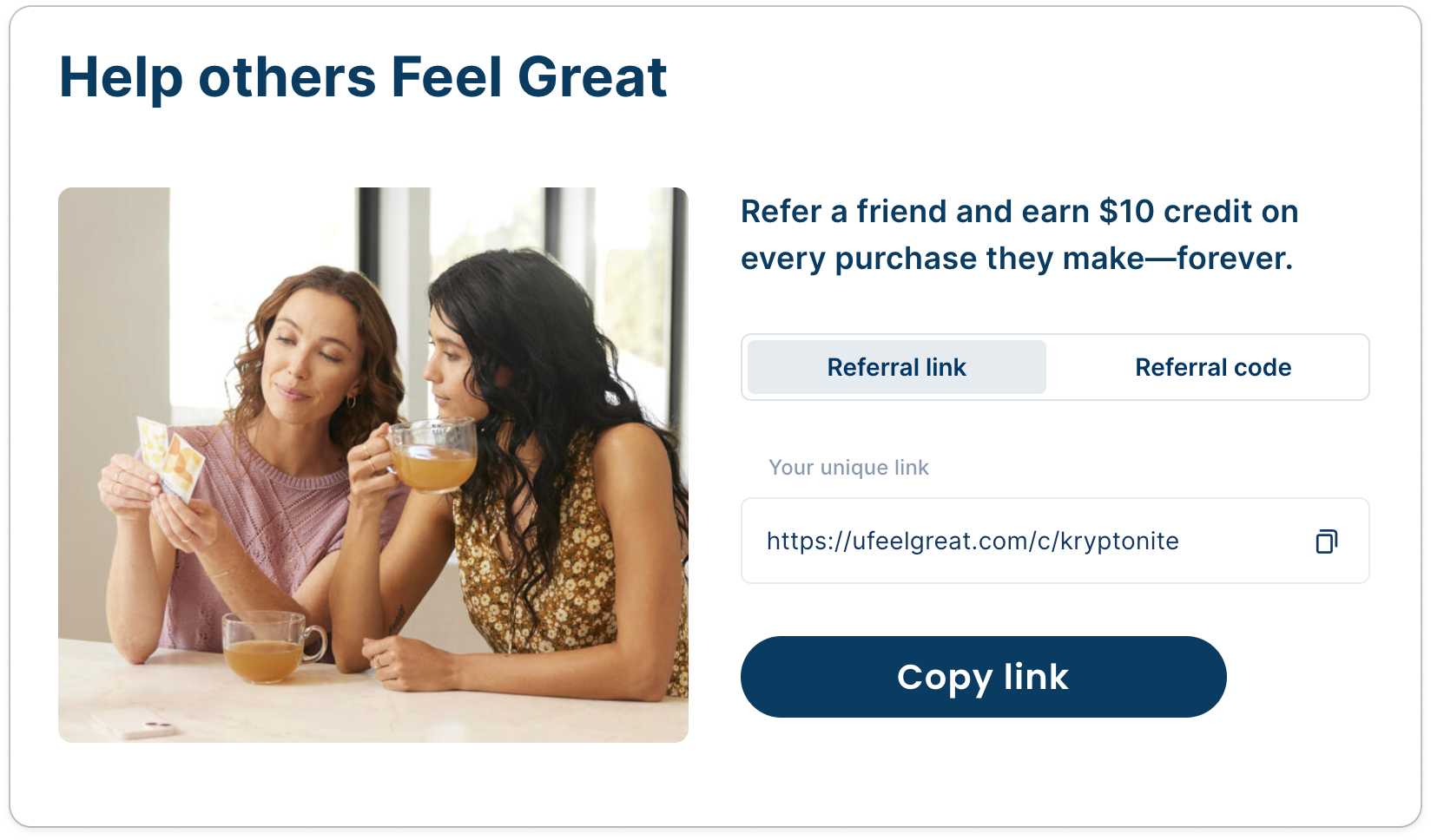 Los miembros tienen un enlace de referencia único que les permite ganar crédito de producto por compartir Feel Great con otros.